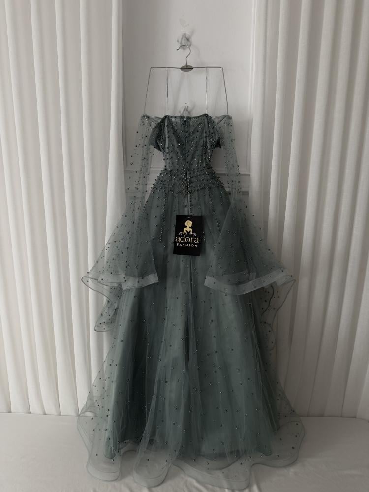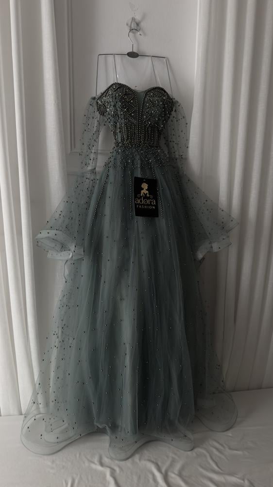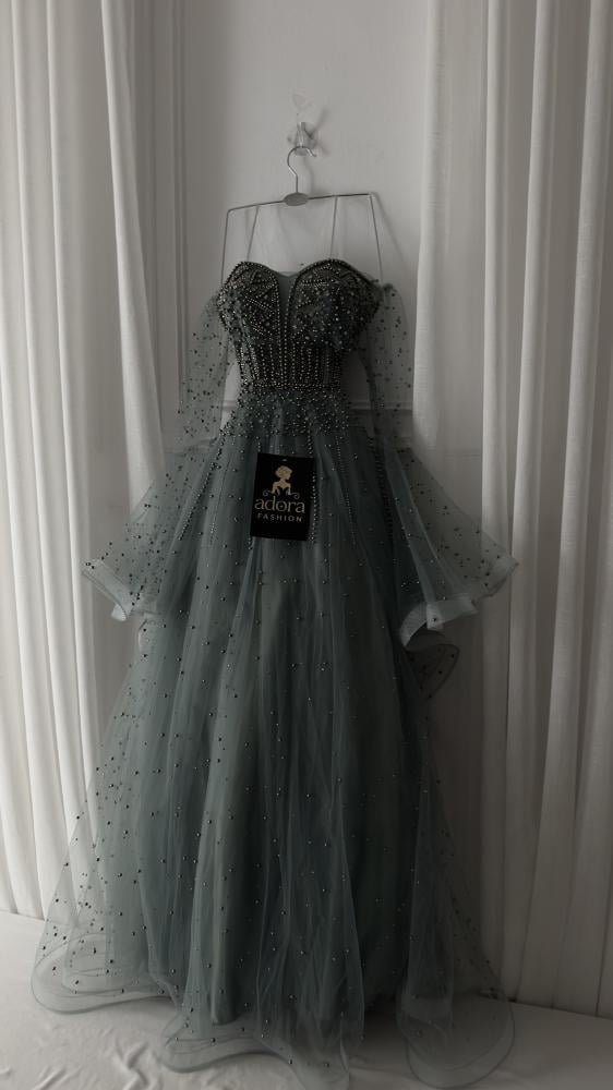 فستان سهرة ملكي بتصميم فخم من Adora Fashion، مصنوع من التول الراقي باللون الرمادي المائل للأخضر. يتميز الفستان بأكمام شفافة طويلة مرصعة بالخرز اللامع، مع تطريز يدوي دقيق على منطقة الصدر والكورسيه يمنحك إطلالة فاخرة ومميزة. تصميم الكورسيه المشدود يبرز جمال الخصر ويمنح قوامًا أنثويًا أنيقًا، بينما تنسدل التنورة الواسعة المزينة باللؤلؤ الصغير لتضيف لمسة من الفخامة والرقي.