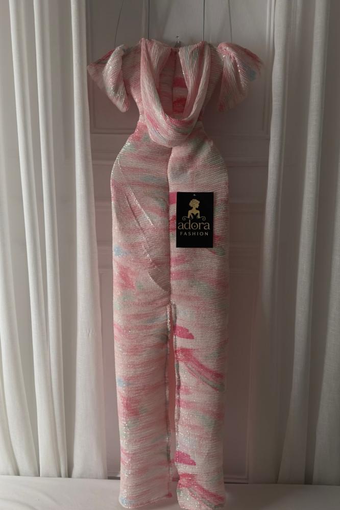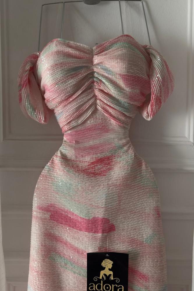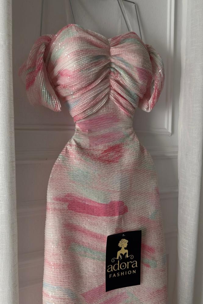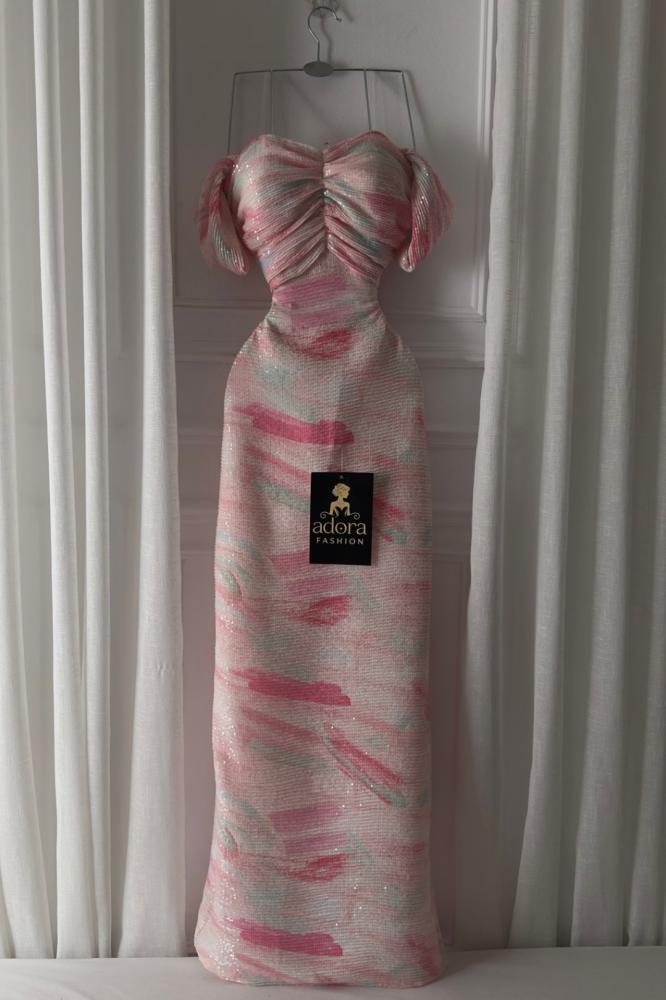 فستان طويل بتصميم أنيق من Adora Fashion، يجمع بين الأناقة والأنوثة. يتميز الفستان بخامة لامعة مزخرفة بدرجات الوردي مع لمسات من الأخضر الفاتح، مما يمنحه مظهرًا عصريًا يخطف الأنظار. التصميم مكشوف الأكتاف مع كشكشة جذابة على منطقة الصدر تبرز جمال القوام، فيما يأتي بقصّة ضيقة انسيابية تضفي مظهرًا أنثويًا ساحرًا.