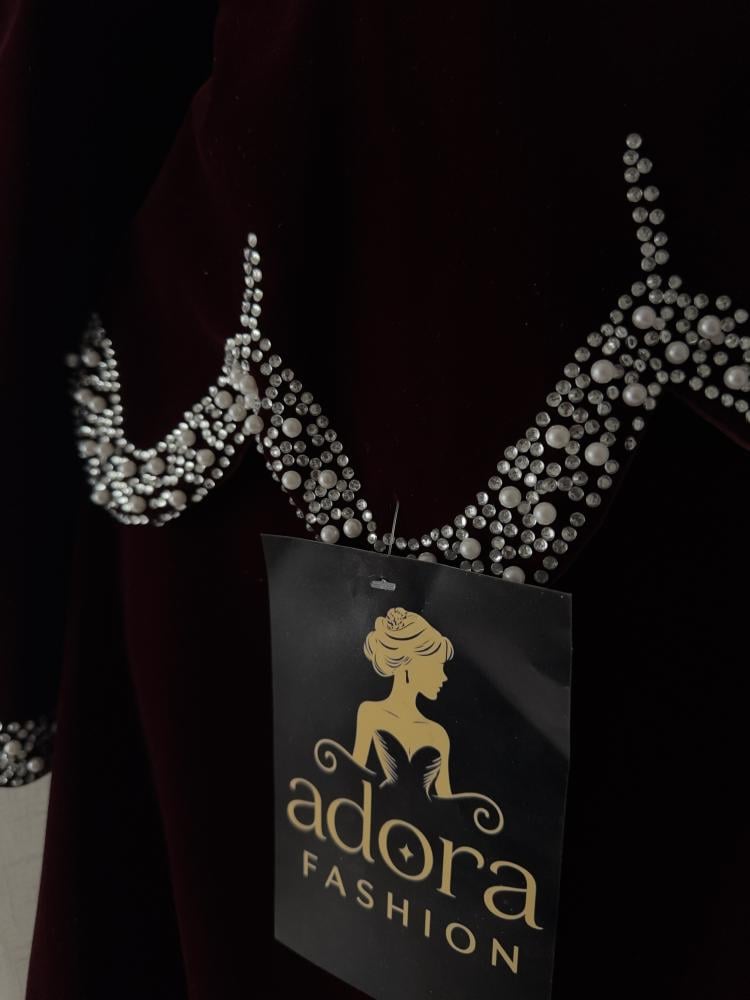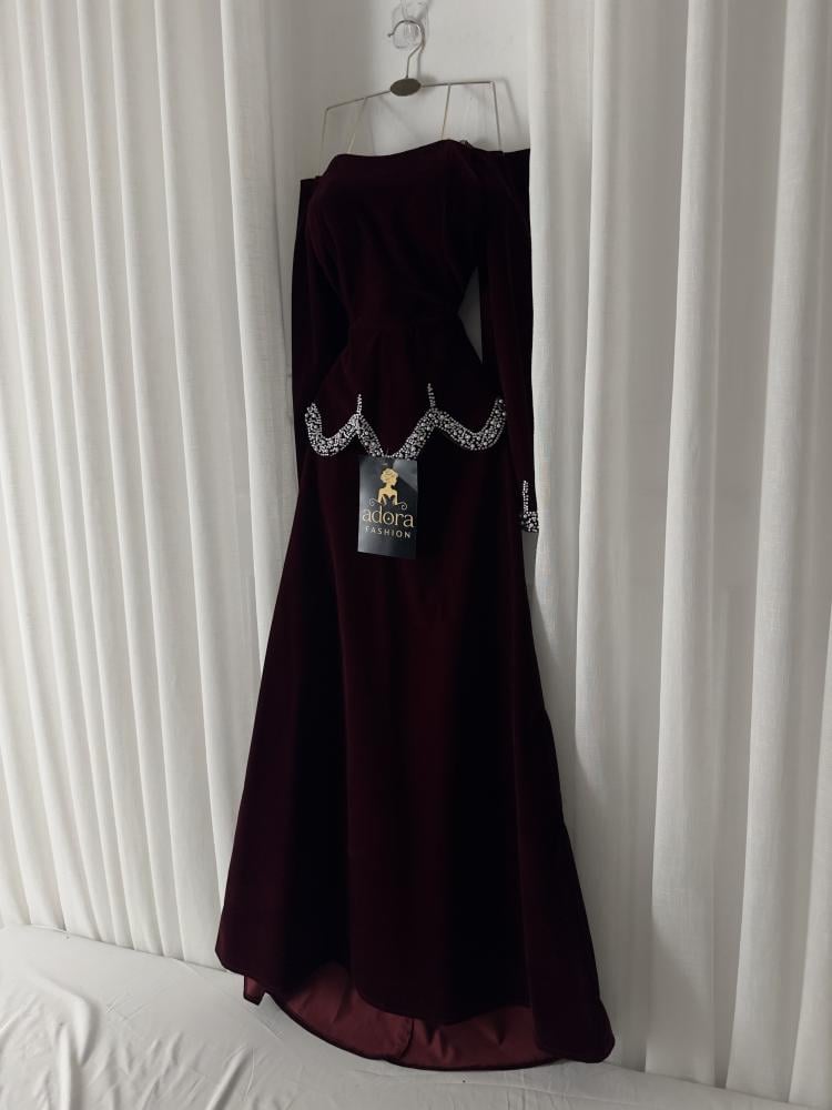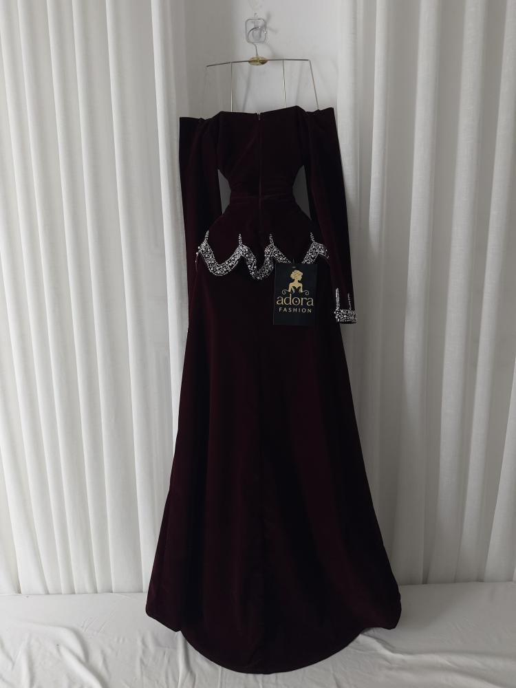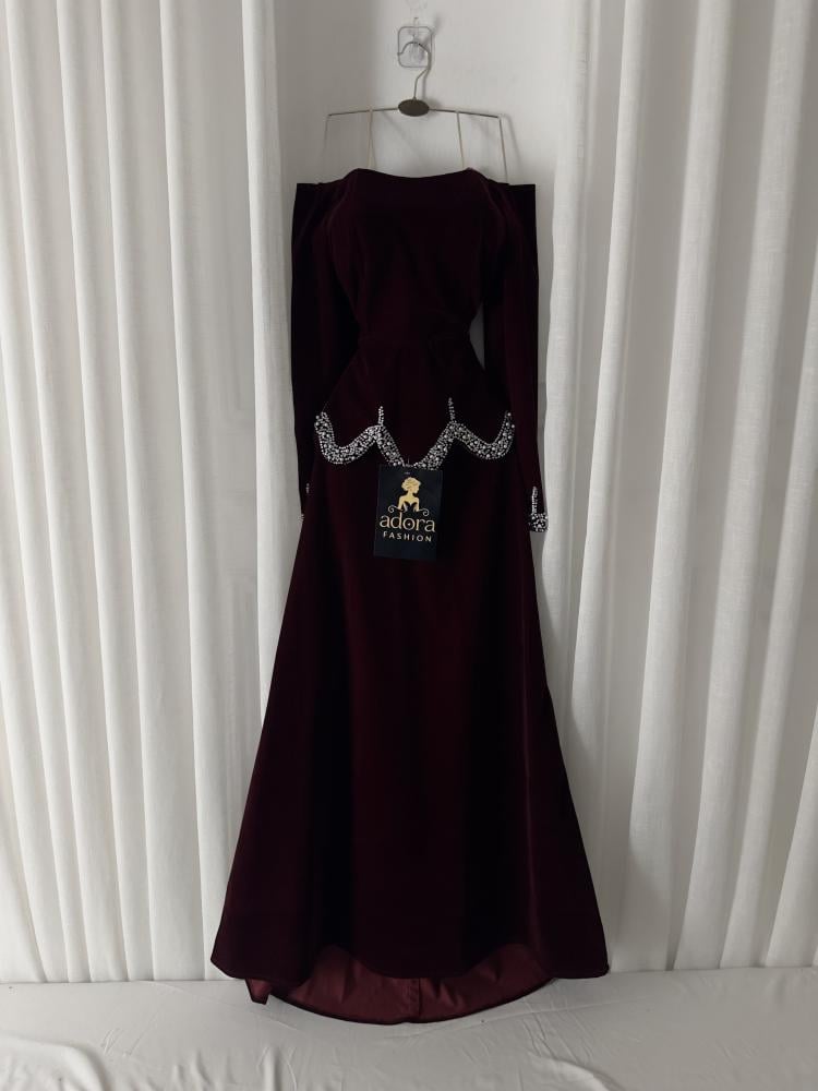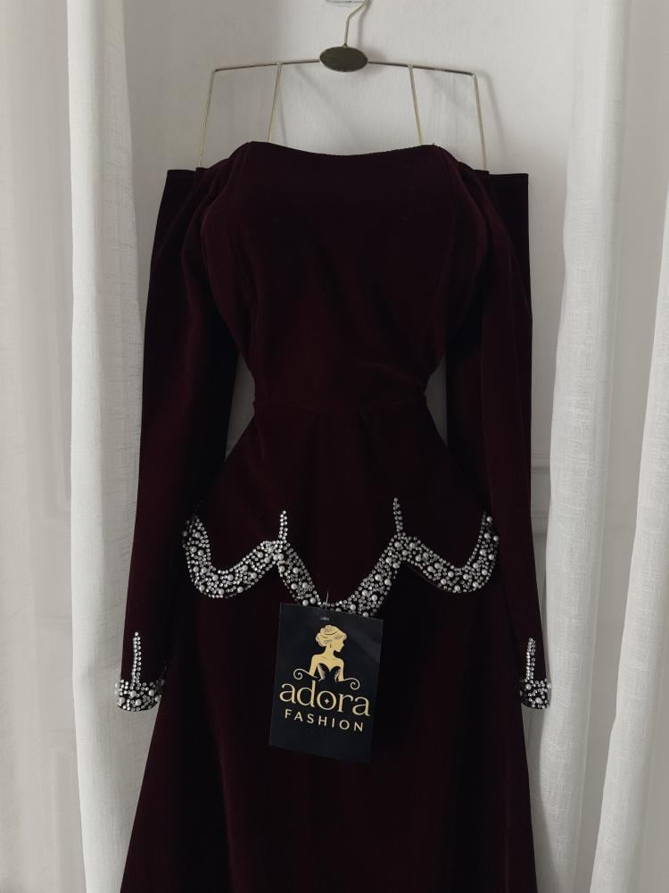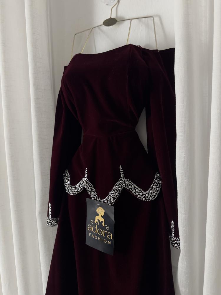 فستان مخمل عودي كم طويل