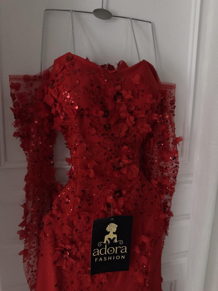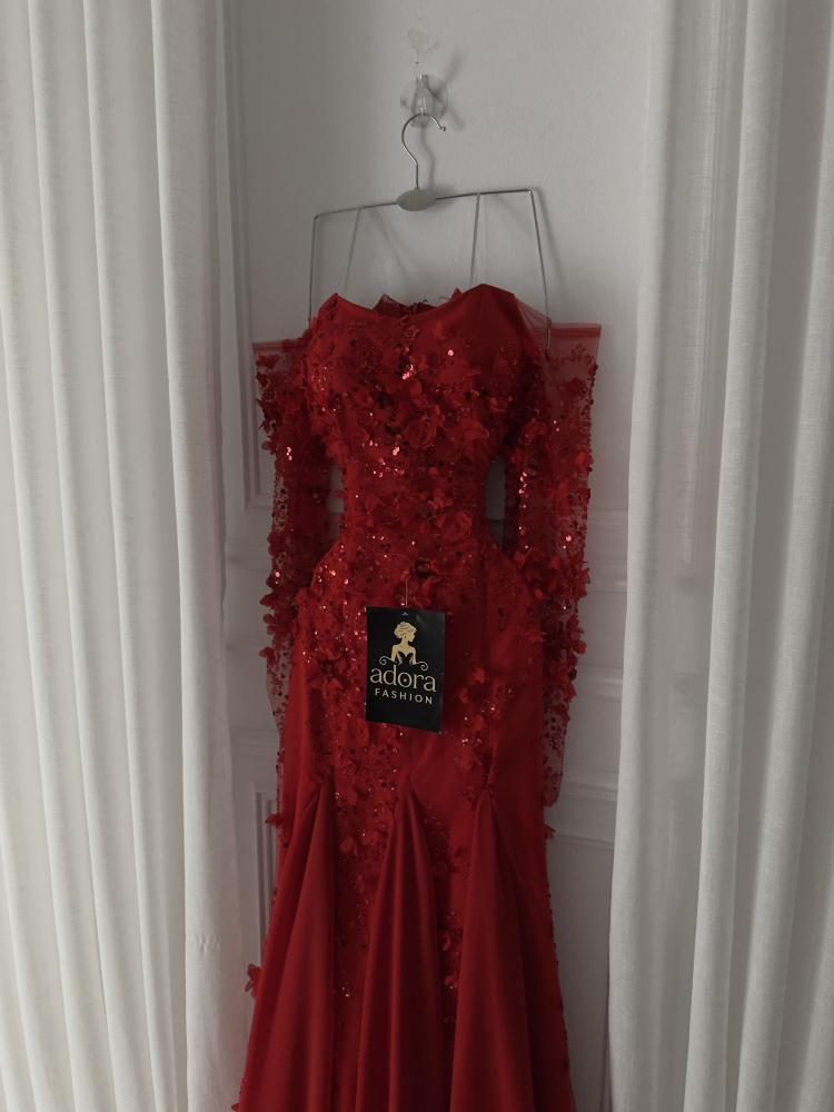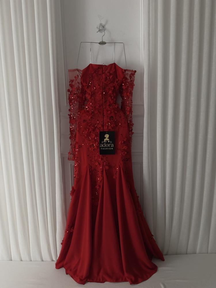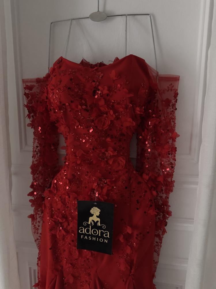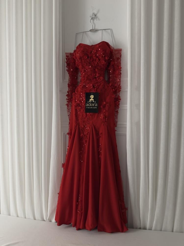 فستان سهرة أحمر أنيق بتصميم راقٍ يناسب المناسبات والحفلات، مصنوع من قماش سهرة فاخر مطبوع بالورود مع بطانة باربي مريحة تضفي لمسة من الفخامة والثبات. يكتمل التصميم بطبقة شيفون انسيابية تمنحك إطلالة أنثوية ساحرة وجاذبية لا مثيل لها. مثالي لإطلالة لافتة في حفلات الخطوبة، الأعراس والمناسبات الخاصة.