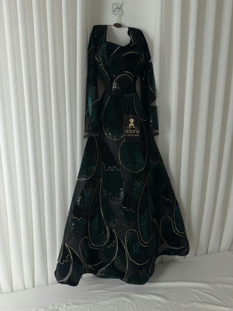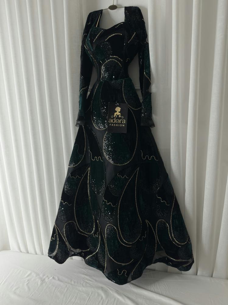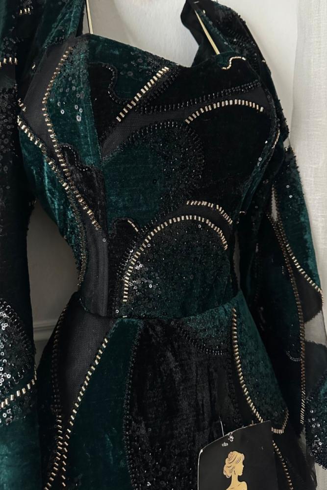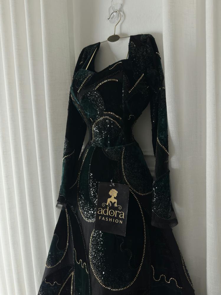 فستان سهره راق من تل فاخر بتدخيلة قطفه مخمل بتصميم قطرات فريد، يزدان بتطريز خرز شك يدوي متقن بمنحه لمسة فخامة لافتة